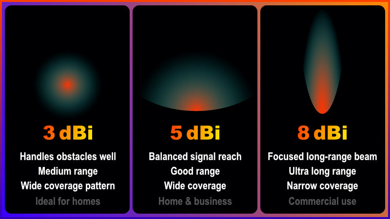 Low‑gain 3 dBi antennas spread the signal widely and handle obstacles, 5 dBi provides a balance of range and coverage, and high‑gain 8 dBi reaches far but in a narrow, easily blocked beam.