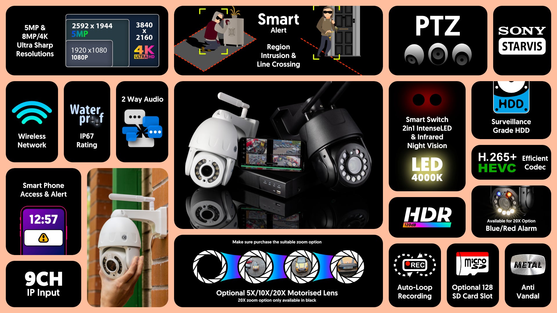 This all-in-one 3x PTZ camera* security kit delivers exceptional features for ultimate protection. Choose between 5MP resolution with 5X or 10X zoom or the stunning 4K/8MP with 20X zoom. Enjoy all-day colour night vision with auto-switching infrared and Intense-LED floodlights, and control pan, tilt, and zoom via the free mobile app, including auto-patrol options. The Sony Starvis sensor ensures unbeatable image quality, even in low light. Features include two-way audio, up to 8TB HDD storage, and an 8dB wireless antenna for strong connectivity. Extra alarms include a sound alarm and a blue/red siren alarm with the 20X option, offering unmatched security versatility.